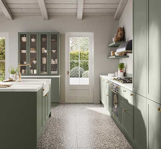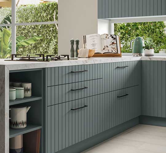 Eingerahmte Türen, vertikale Linien, die den Stil verstärken, helle und großzügige Farboptionen bringen Ästhetik in Ihre Küche und sorgen für eine entspannte Atmosphäre.